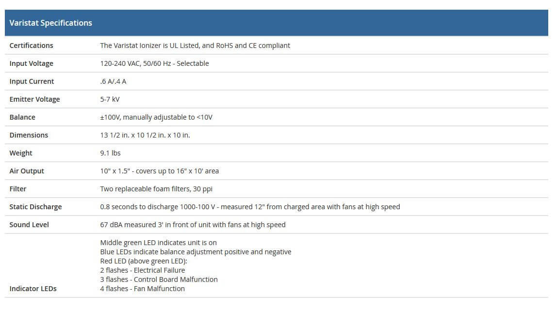 This static eliminator features ion producing emitter points and two 30 PPI replaceable foam filters to ensure optimal performance over extended periods of use. Also offering a built-in LED display that indicates proper function, the Varistat is designed with important safety features such as its current limiting circuit to protect against electrical hazards, and opertating quietly and well below OSHA standards for noise exposure. The Varistat static eliminator is a reliable and effective solution for reducing static charges on sensitive products and protecting against static, dust, debris and other pesky particulate.